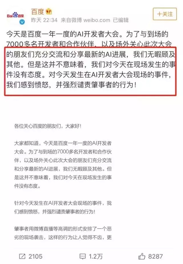 当日晚,百度官方微博再次对此事发声,称“我们无暇顾及其他。但这并不意味着,我们就对今天在现场发生的事件没有态度。对今天发生在AI开发者大会现场的事件,我们感到愤怒,并强烈谴责肇事者的行为!”言辞坚定的否认网上关于此事件为百度炒作的猜测。